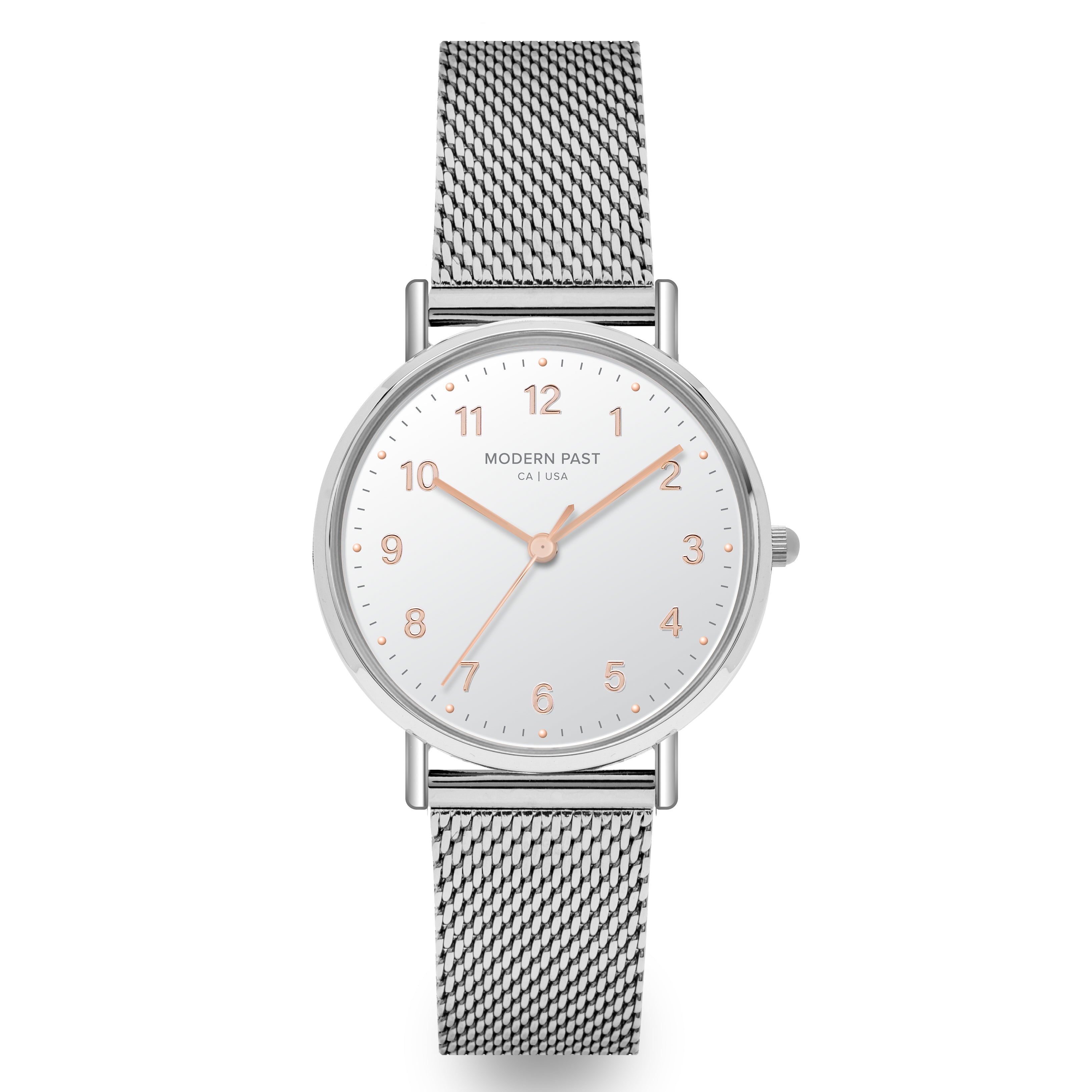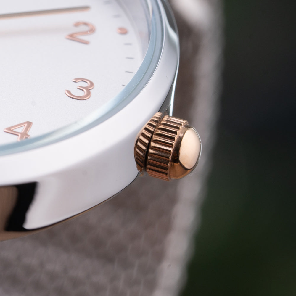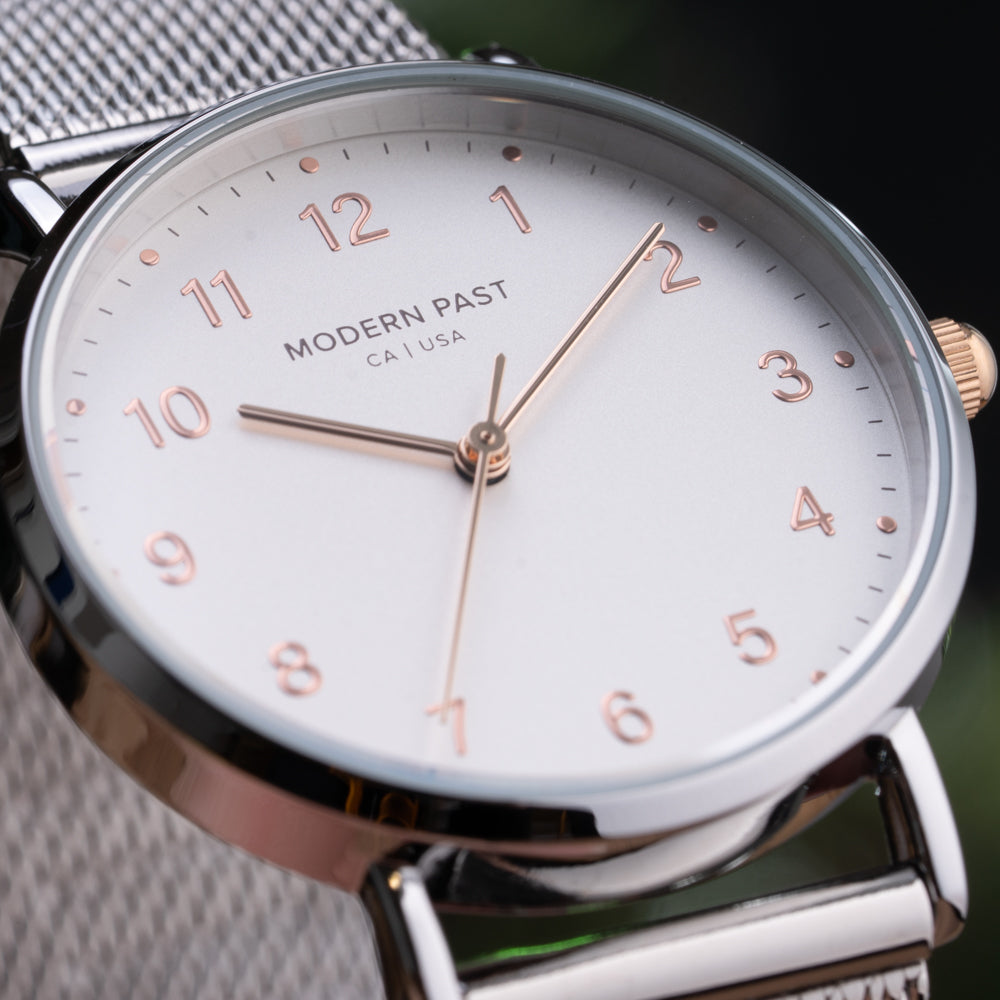 Point Taken. Right on target with a perfect balance between fashion and function, the Emma is an easy addition to your daily dress code. The dial features feminine numerical indices and a brushed finish that easily goes between fun and formal. This Emma Mesh Silver / White looks classic yet modern with its classic white sandblasted dial with contrasting rose gold numerical indices, and a silver stainless steel mesh band.