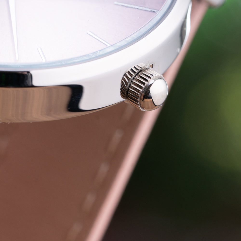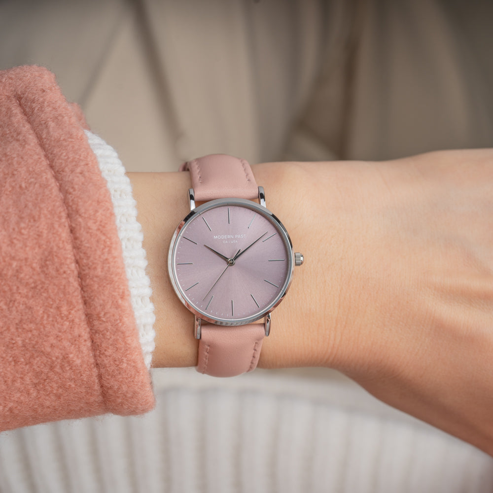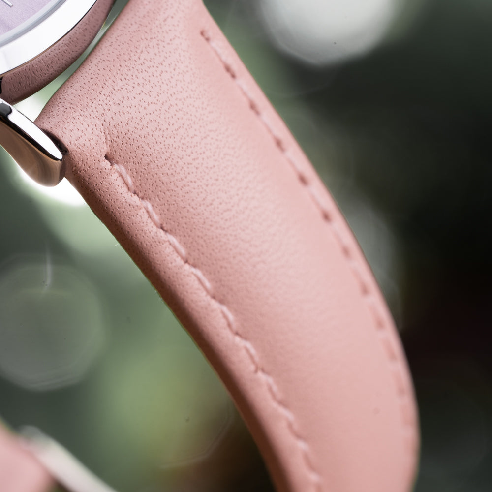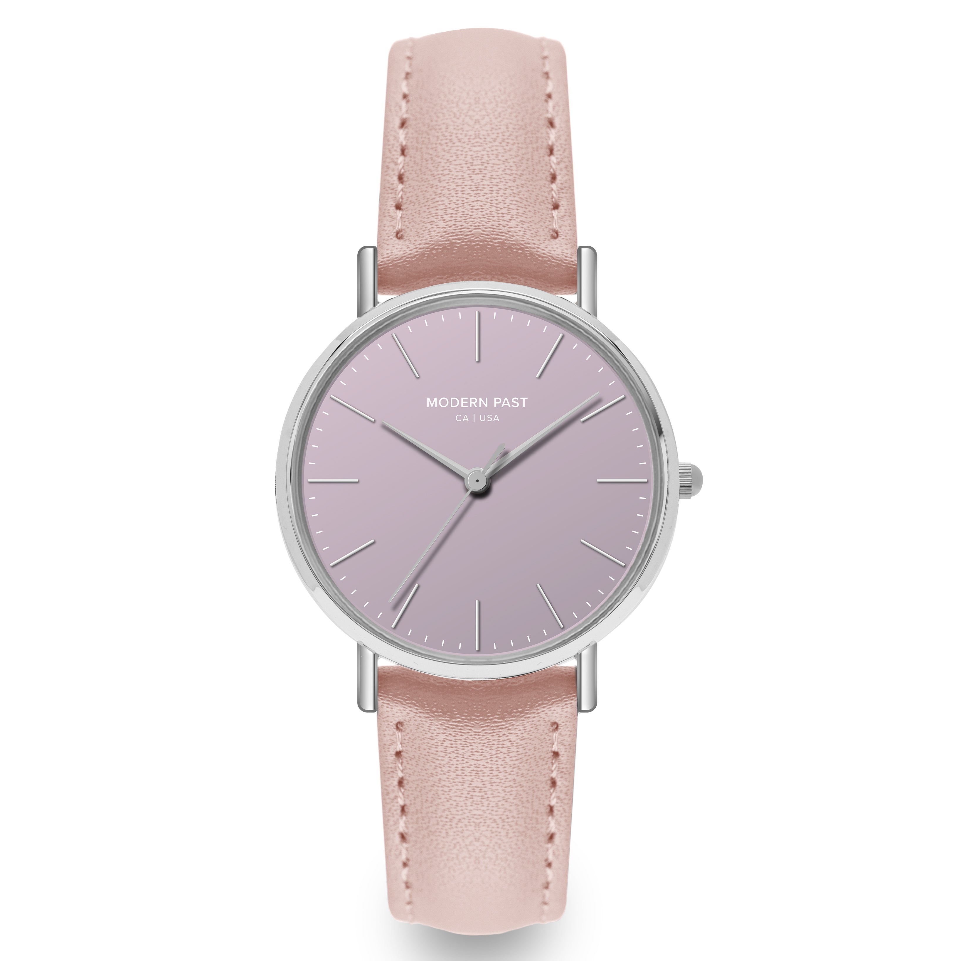 Vintage-inspired modern aesthetic, sophisticated yet simple, the Lola is for the woman that radiates confidence through her personal style and essence. This elegant Lola Pink Leather Silver / Purple is featured with its light purple dial with simple markings, and completed with a soft and comfortable pink genuine leather band - a design looks good with anything you’d wear to work or on the weekend.