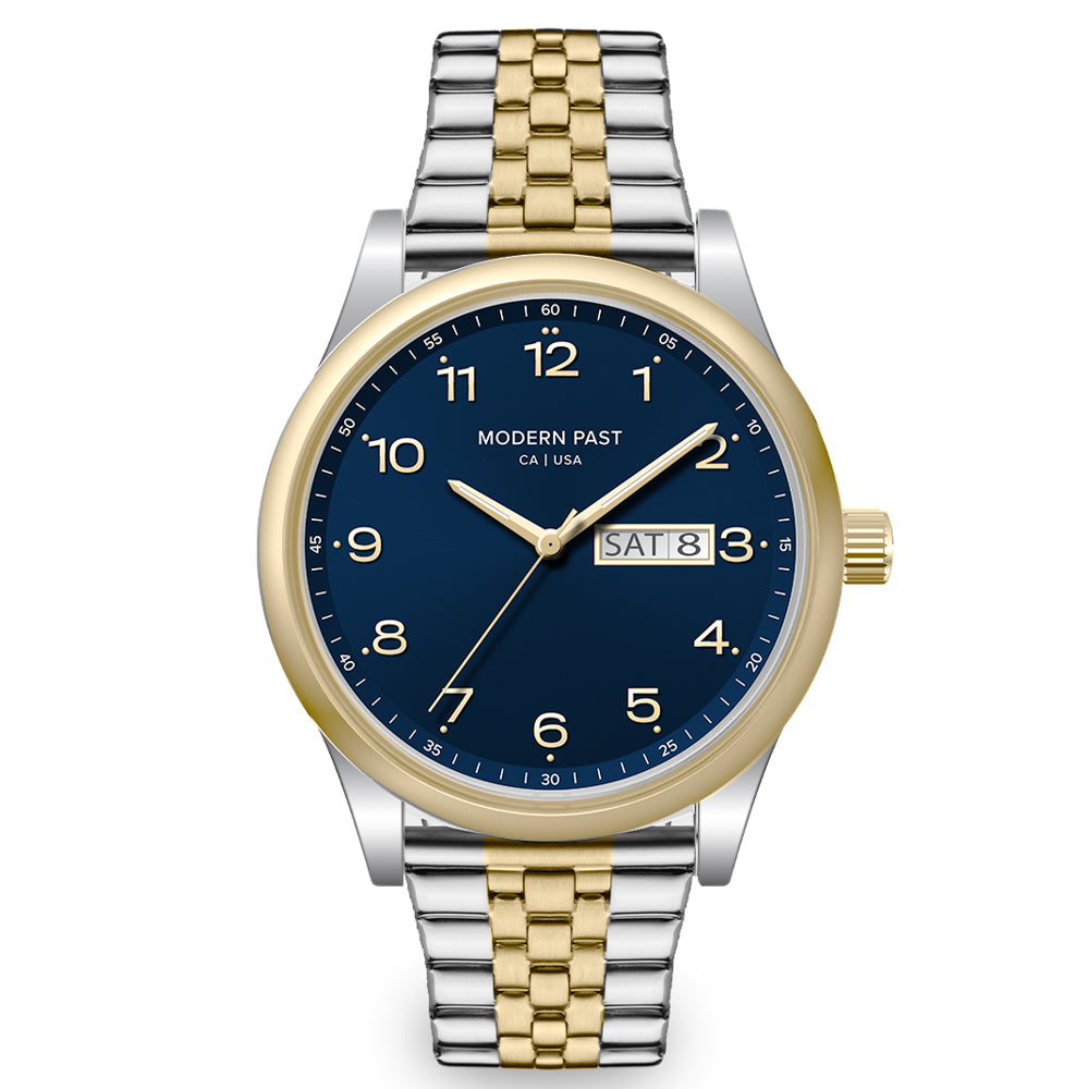 The Harrison is powered by a reliable Japanese quartz movement with classic day-date function and equipped with a 5-piece stainless steel strap. Ideal for those who value straightforwardness as much as precision, this 40mm Harrison Silver Gold Stainless Link / Blue is a stylish accompaniment to the working day. The hourly large numbers on the blue dial look great, whether with a suit or smart casual attire, while the large dial is easy to read.