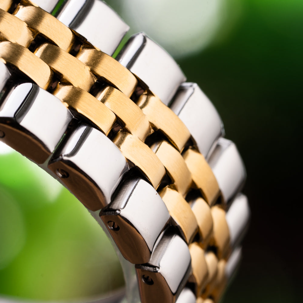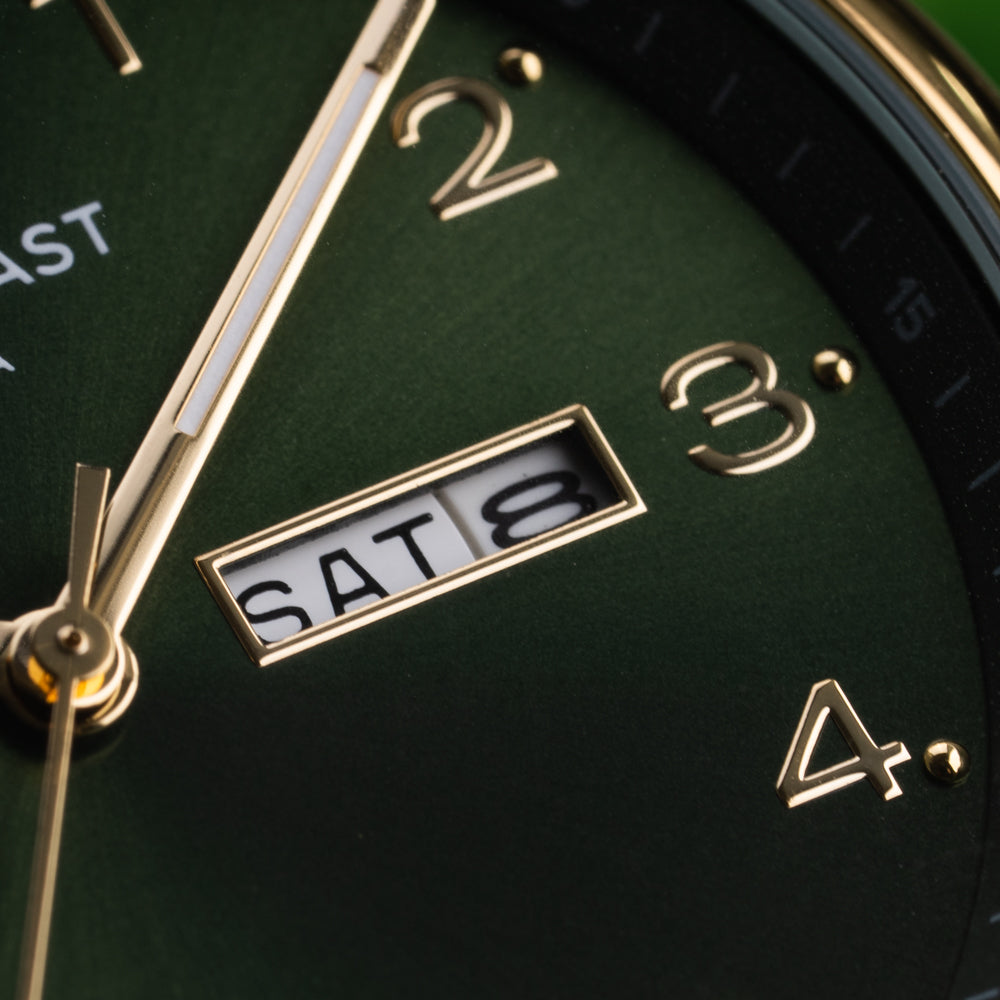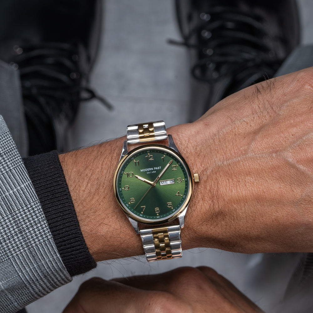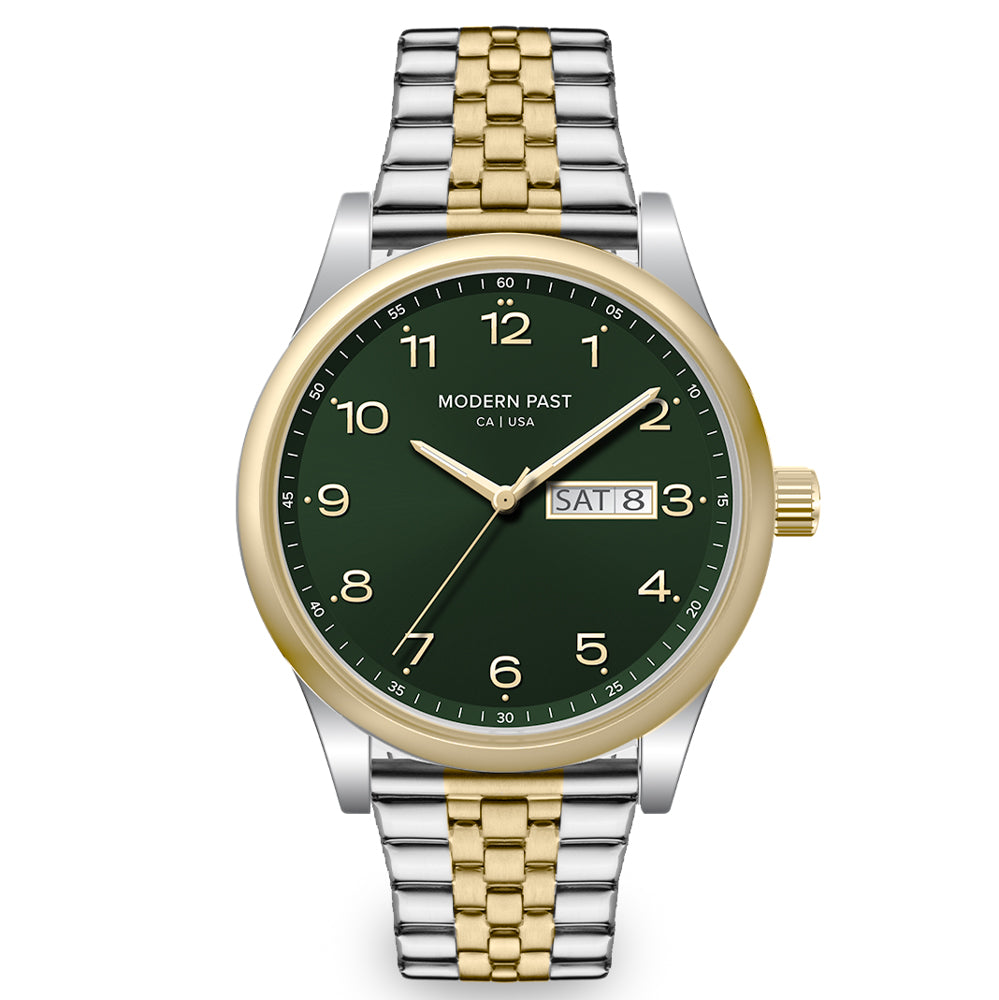 The Harrison is powered by a reliable Japanese quartz movement with classic day-date function, and equipped with a 5 piece stainless steel strap. Ideal for those who value straightforwardness as much as precision, this 40mm Harrison Silver Gold Stainless Link / Green is a stylish accompaniment to the working day. The hourly large numbers on the green dial look great whether with a suit or smart casual attire, while the large dial is easy to read.