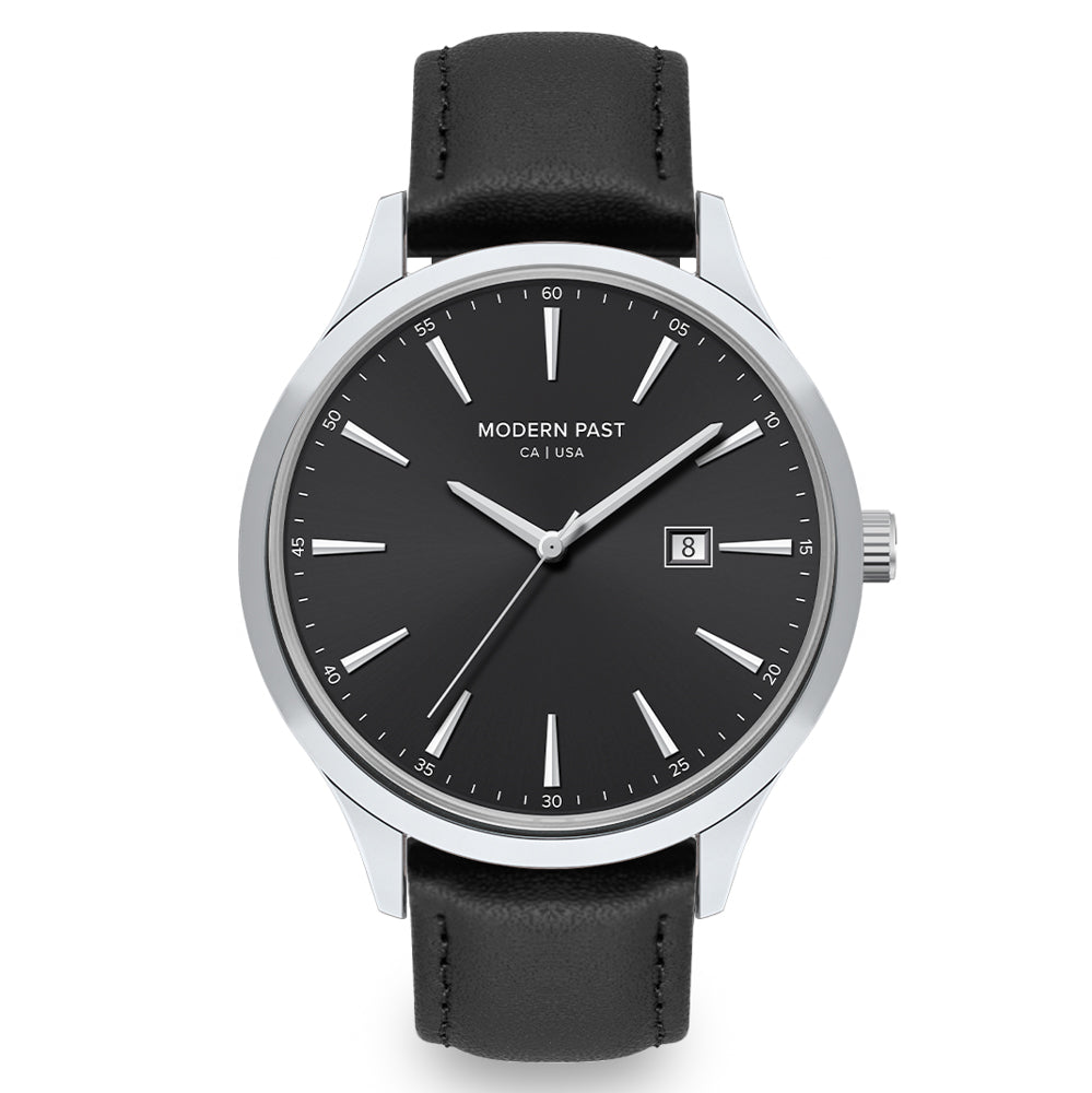 The Parker is powered by a reliable Japanese quartz movement with date function and equipped with a comfortable genuine leather strap. Parker Black Leather Silver / Black classic design, simple and commanding with its black dial detailed with silver hourly markings, makes it a timeless wearable time-teller and a great addition to any occasion.