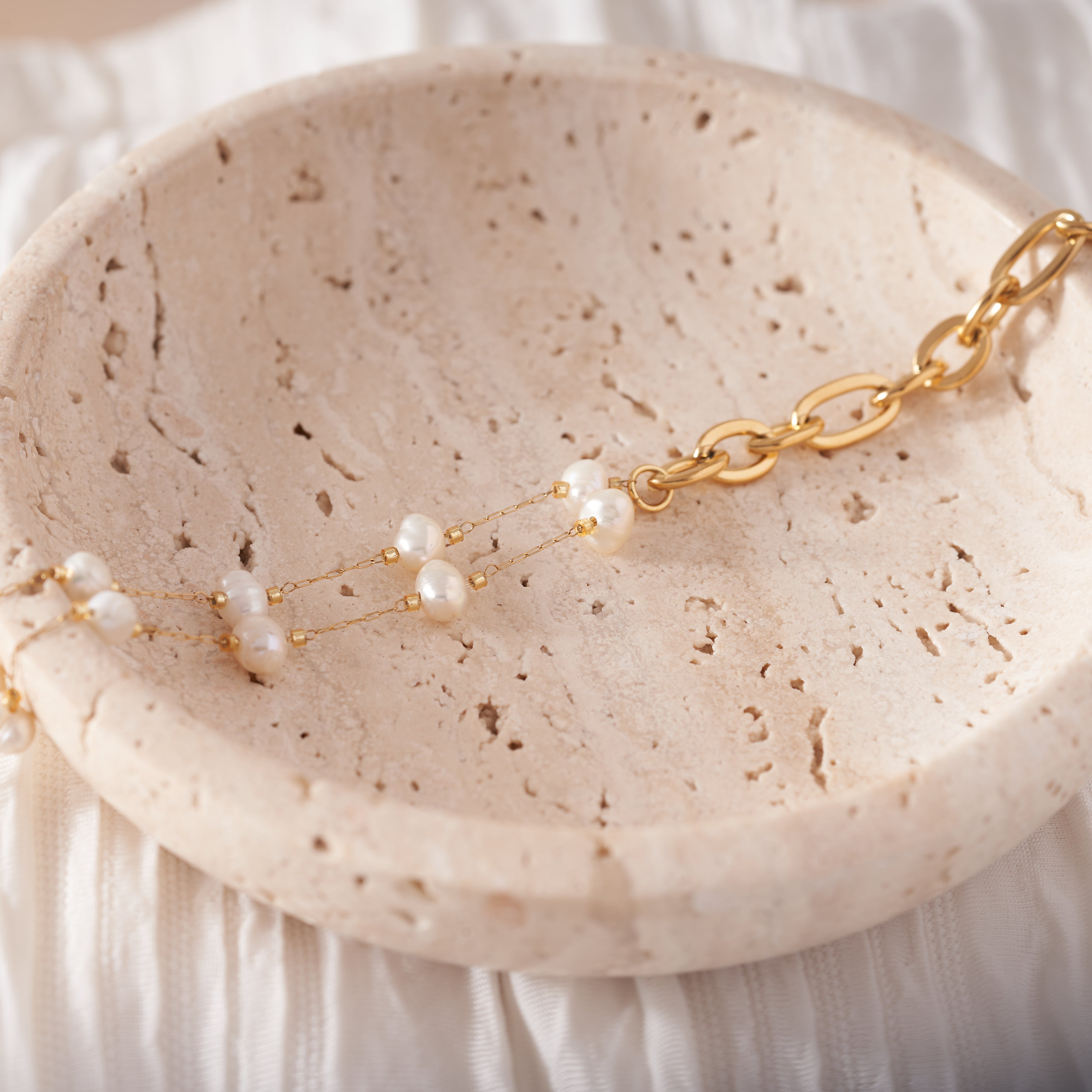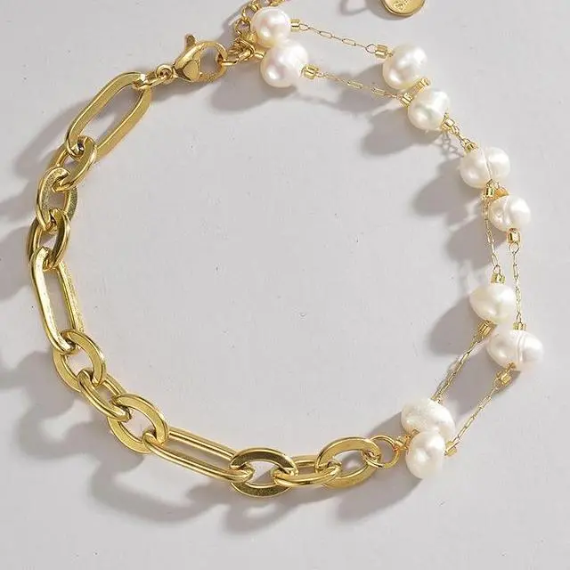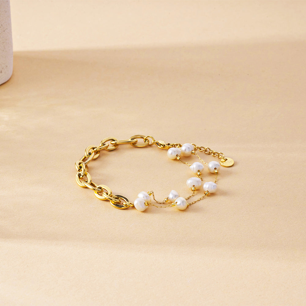 Wrap your wrist in a bracelet that weaves together golden luxury with lustrous pearls. It's a symbol of refined taste and understated beauty.