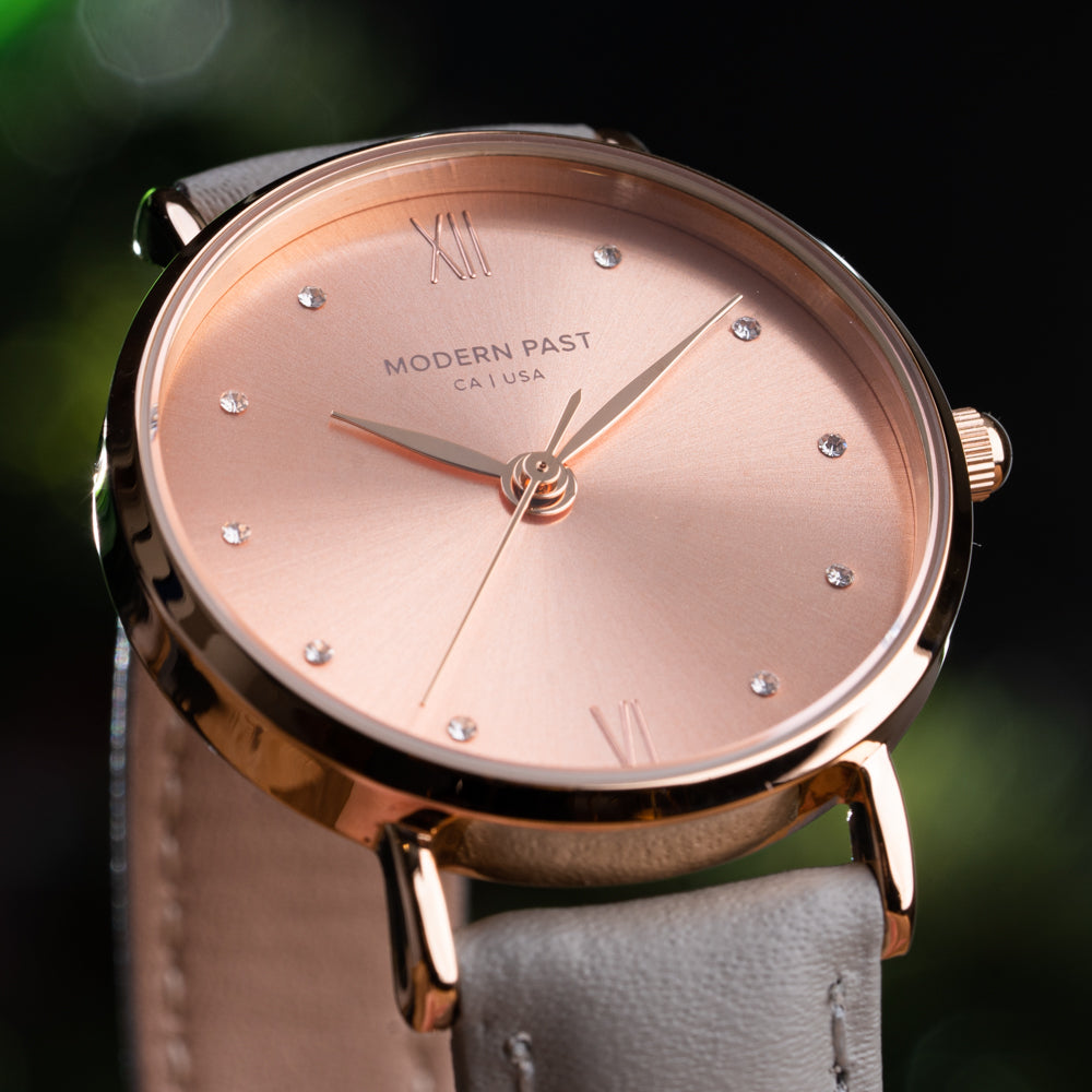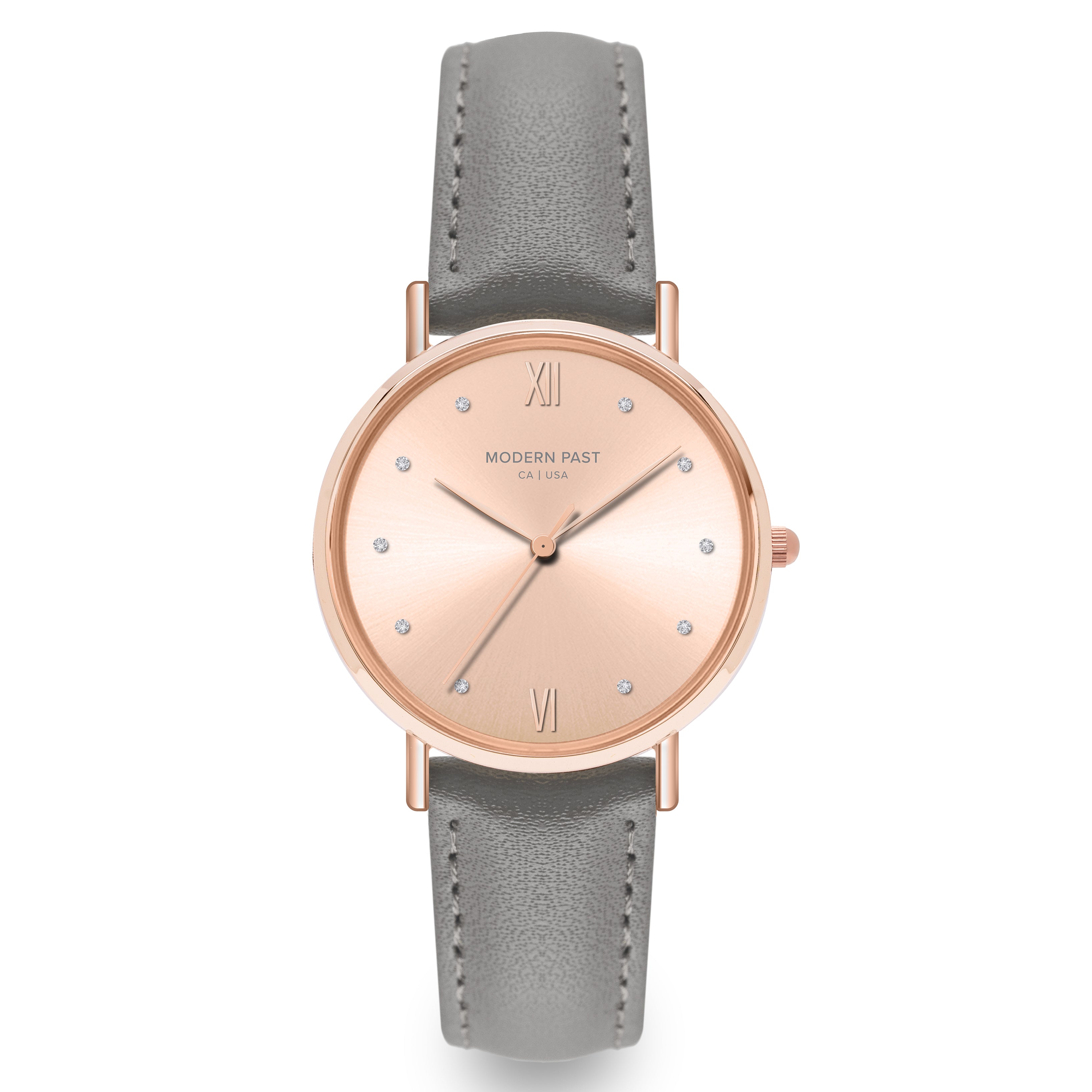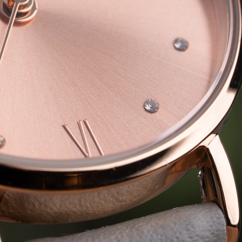Sophia is the embodiment of everyday elegance loaded with small details. The design of Sophia Grey Leather Rose Gold / Rose Gold looks vintage yet modern at the same time - the classic gold dial embellished with tiny and sparkling crystals and balanced Roman numerals complements the rose gold perfectly. So if you want something effortless but still refined, then this timepiece is built for you.